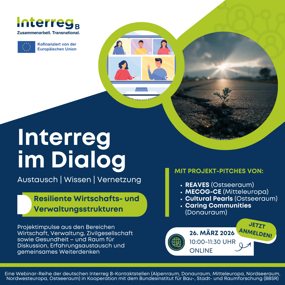 Im Rahmen der Webinar-Reihe, organisiert durch die deutschen Interreg B-Kontaktstellen gemeinsam mit dem Bundesinstitut für Bau-, Stadt- und Raumforschung (BBSR), ist für das Webinar am 26.03.2026 zum Thema „Resiliente Wirtschafts- und Verwaltungsstrukturen“ die Anmeldung ab sofort und bis zum 19.03.2026 möglich.